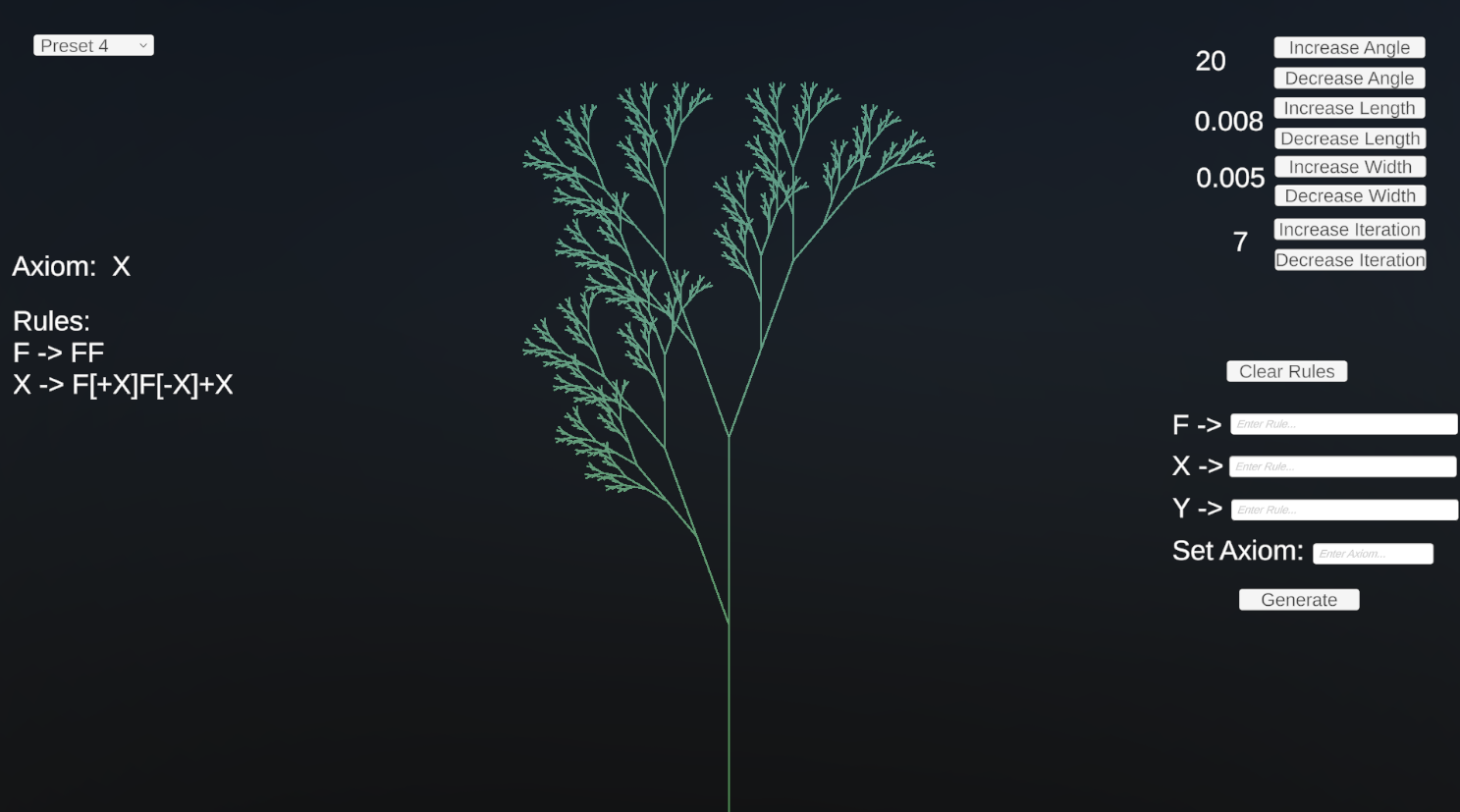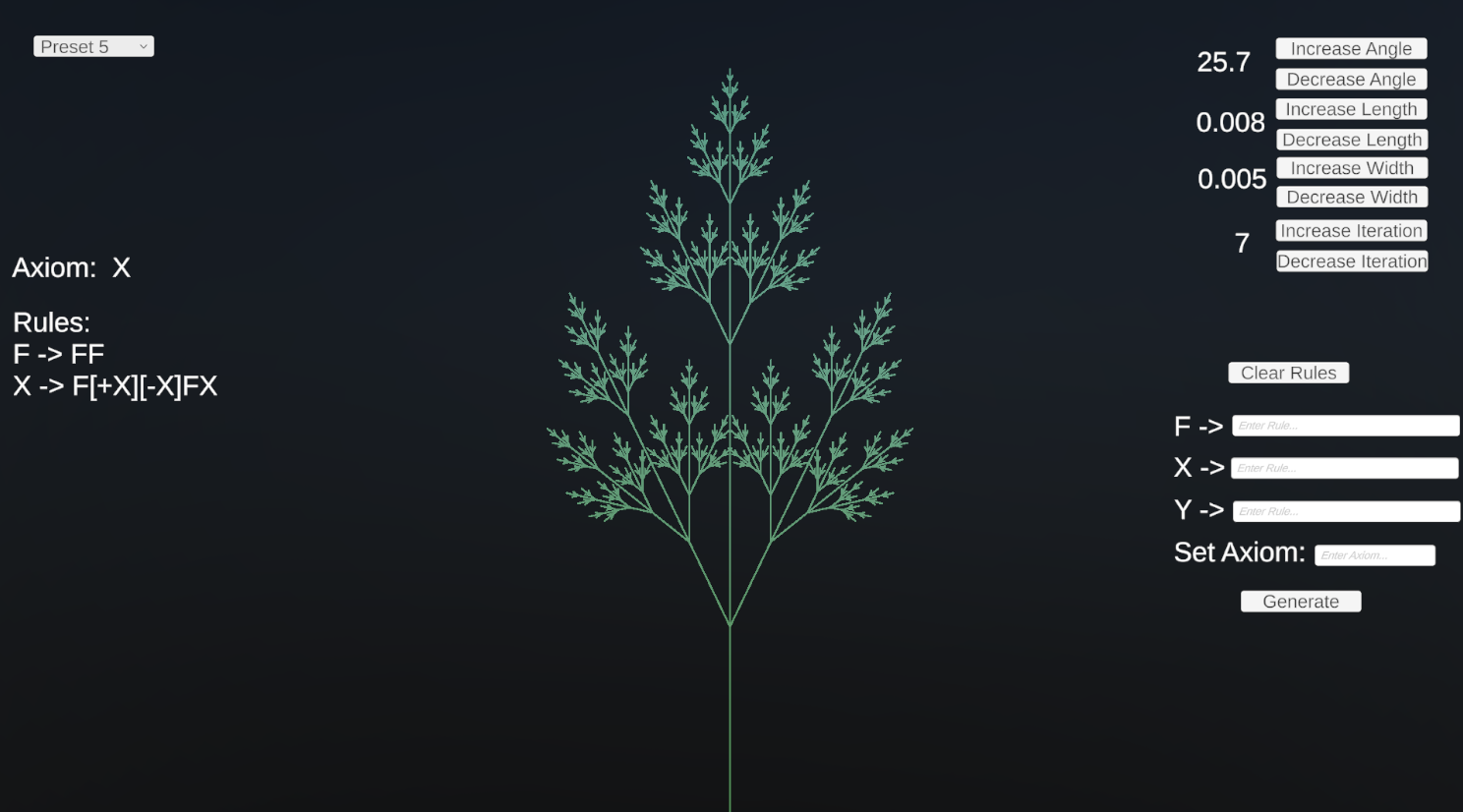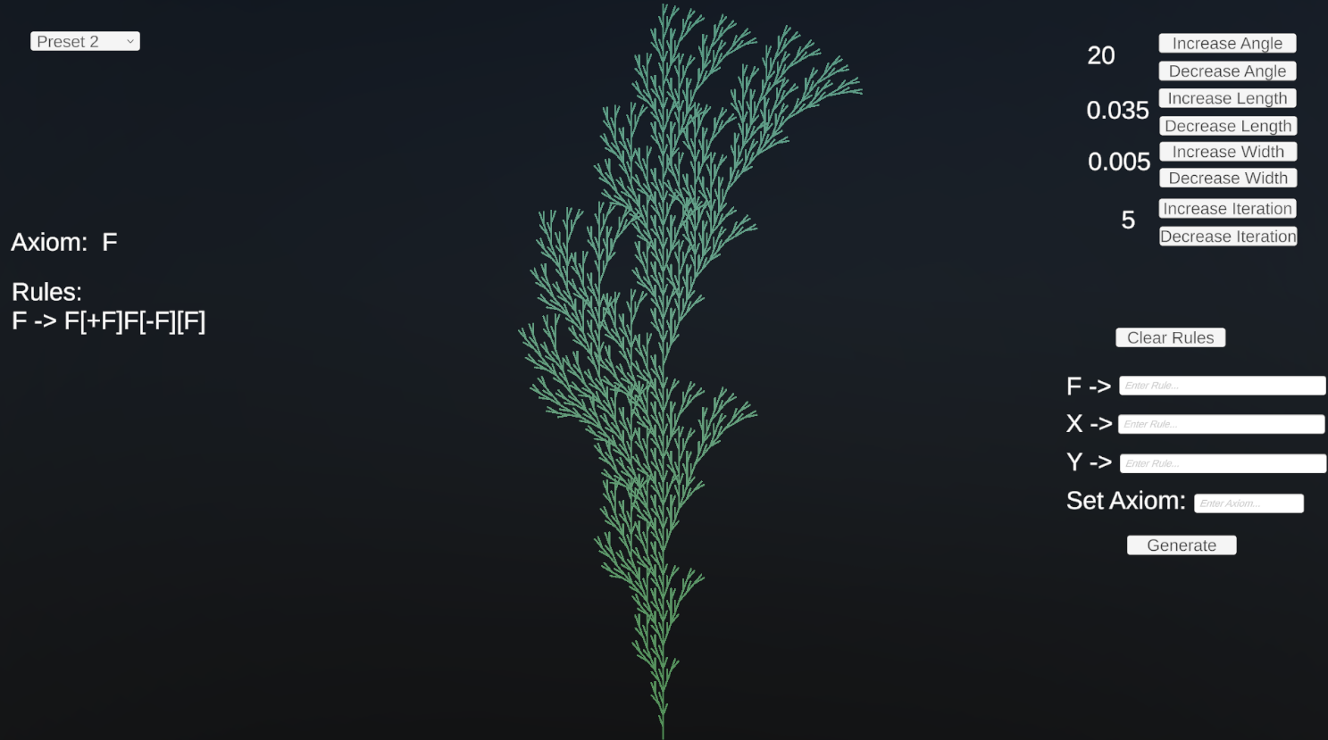 This project explores the implementation of a Lindenmayer System (L-system) engine within Unity using C#, with the goal of generating visually coherent, plant-like structures through formal grammar rewriting. L-systems provide a compact rule-based framework capable of producing complex forms from simple symbolic expressions, making them well-suited for procedural modelling. The engine developed for this project expands user-defined axioms and production rules into increasingly detailed strings, which are then interpreted in real time to construct structures from line-rendered segments and instanced prefabs. A stack-based approach is employed to manage branching behaviour, allowing the system to create intricate multi-level forms that resemble biological growth patterns.