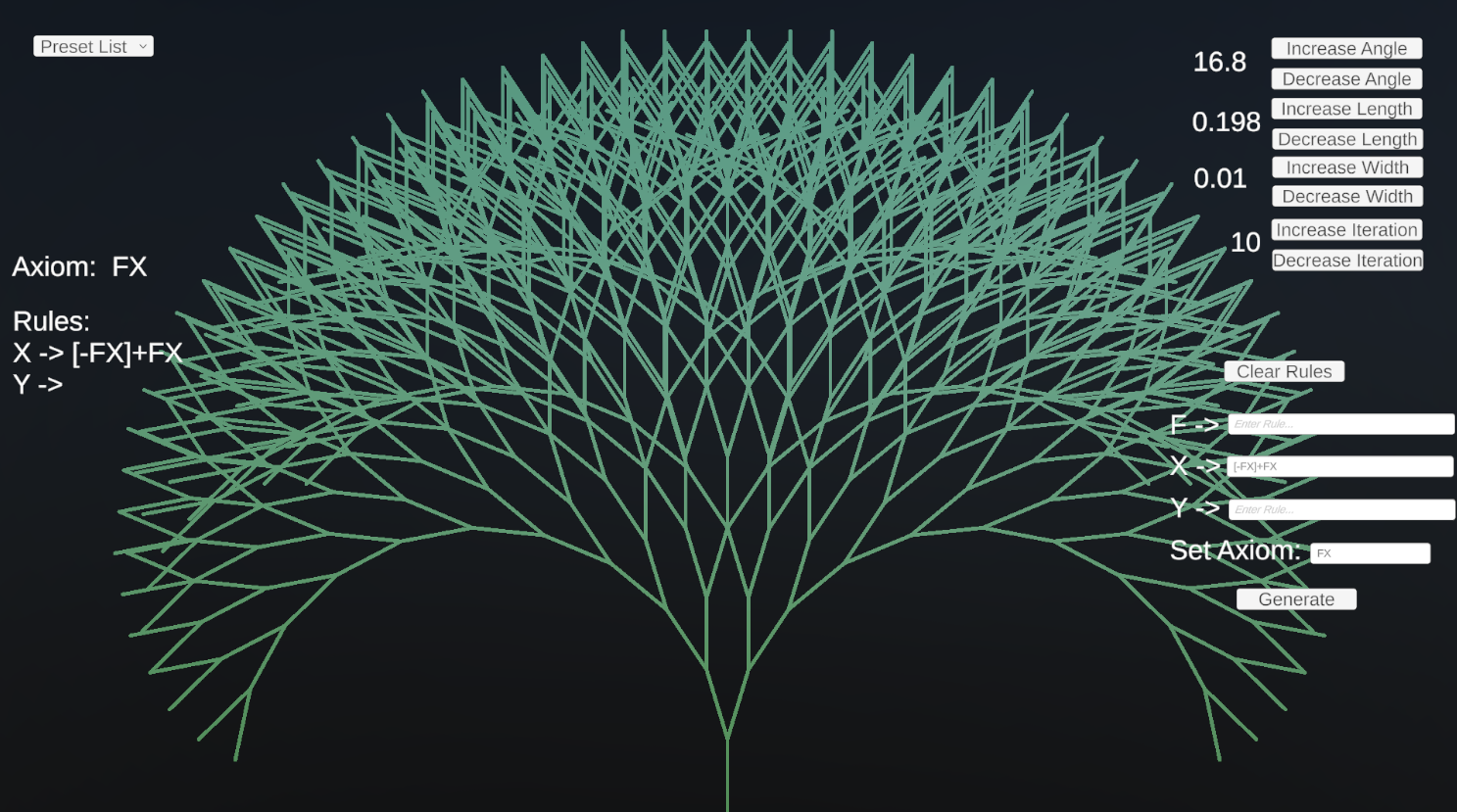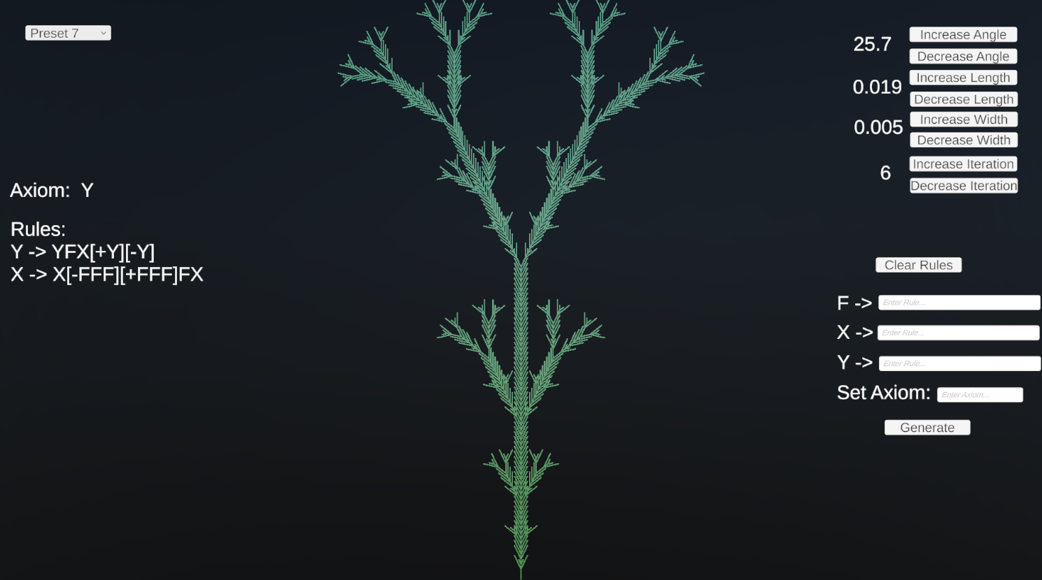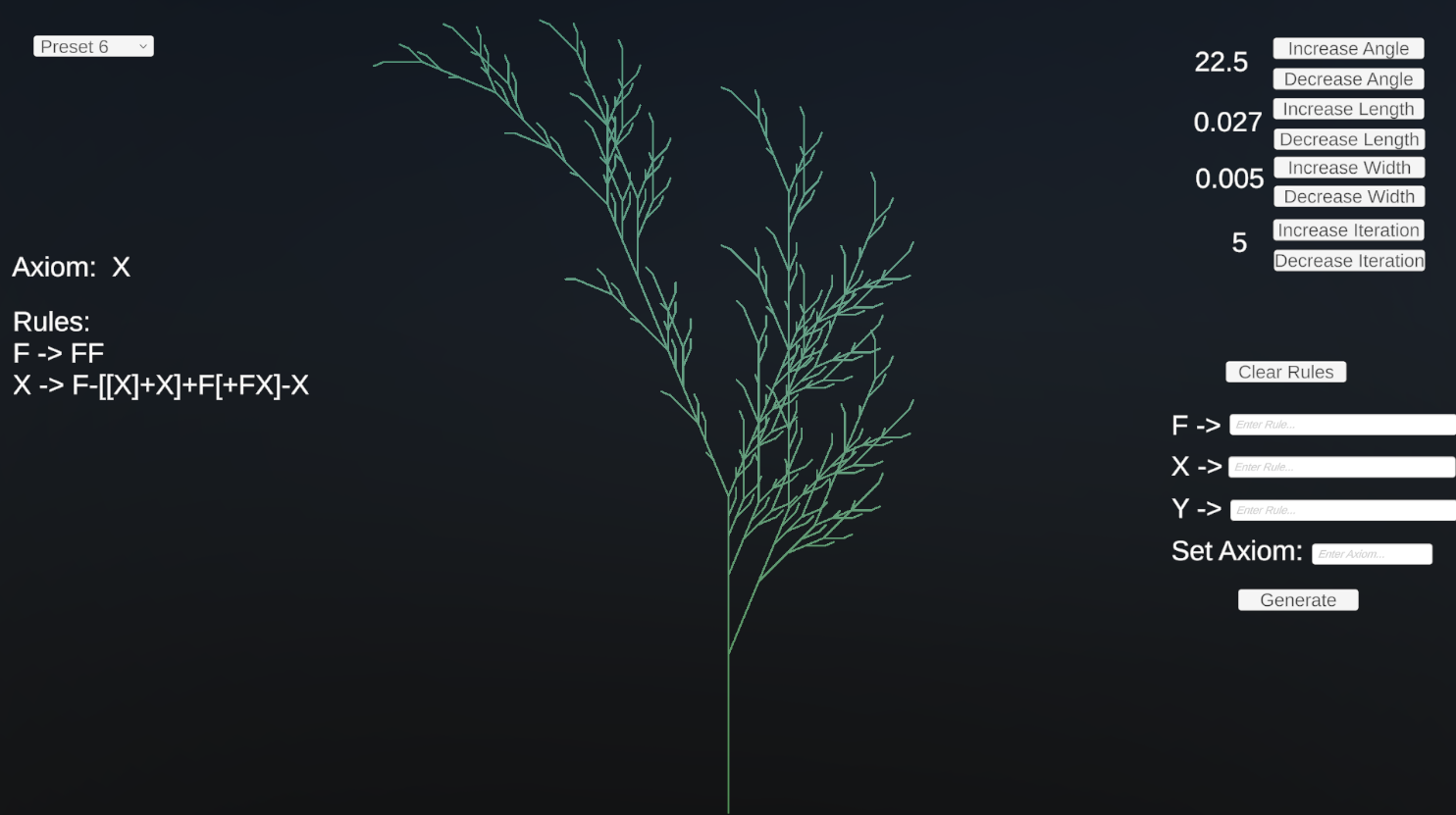 This project explores the implementation of a Lindenmayer System (L-system) engine within Unity using C#, with the goal of generating visually coherent, plant-like structures through formal grammar rewriting. L-systems provide a compact rule-based framework capable of producing complex forms from simple symbolic expressions, making them well-suited for procedural modelling. The engine developed for this project expands user-defined axioms and production rules into increasingly detailed strings, which are then interpreted in real time to construct structures from line-rendered segments and instanced prefabs. A stack-based approach is employed to manage branching behaviour, allowing the system to create intricate multi-level forms that resemble biological growth patterns.