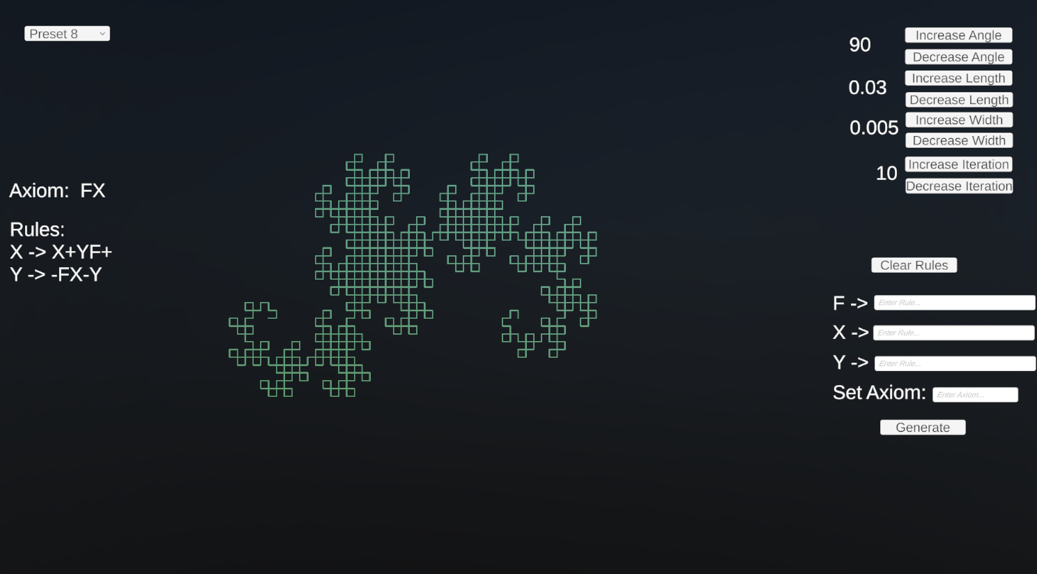 The system was tested on a range of grammars, from simple fractals to more elaborate botanical models, and consistently produced stable and coherent structures. Performance remained strong at moderate iteration depths, with predictable declines as the exponential nature of L-systems increased object counts. The resulting models are fully interactive Unity objects capable of participating in lighting, physics, and environmental effects, demonstrating the engine’s value for real-time applications. Through this implementation, the work highlights the effectiveness of L-systems as a tool for procedural content generation and showcases the visualization of formal grammars in an interactive environment.